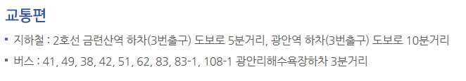 부산 2호선 지하철 금련산역에 내리면 백사장까지 가깝습니다. 지하철로 이동하시기를 가장 추천드립니다.