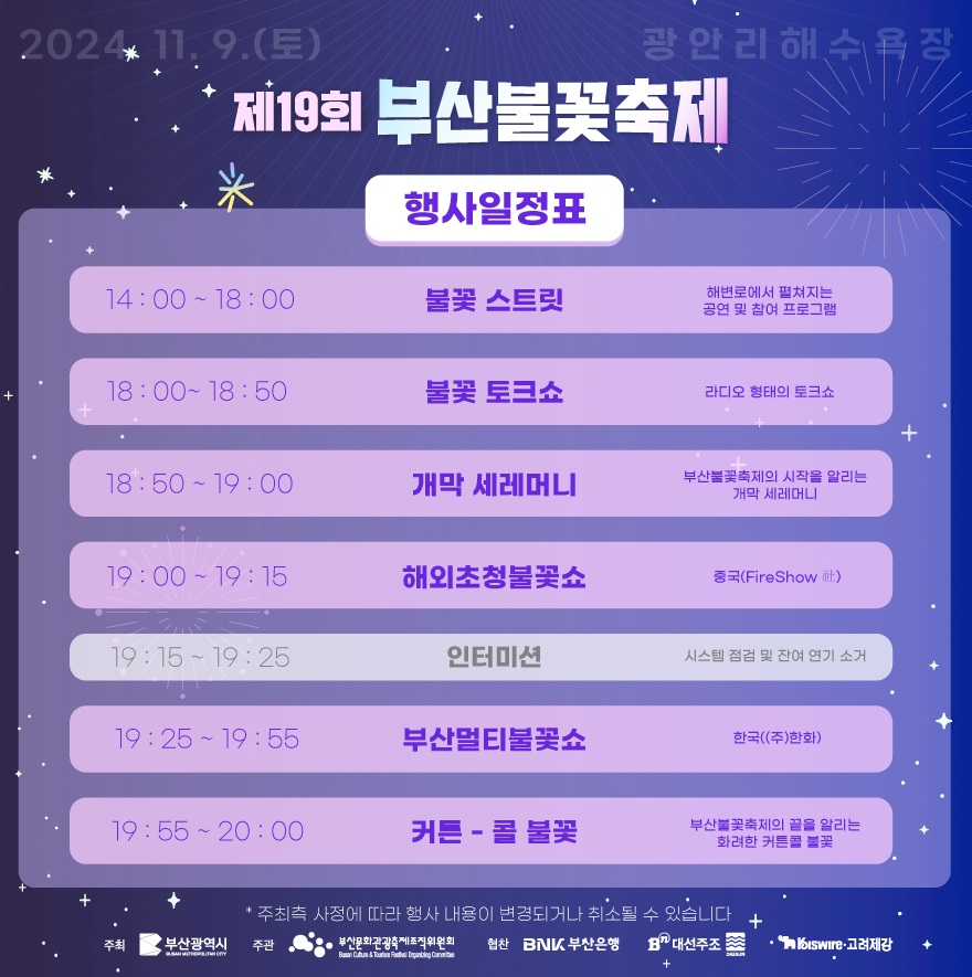 - 주최: 부산광역시, (사)부산문화관광축제조직위원회