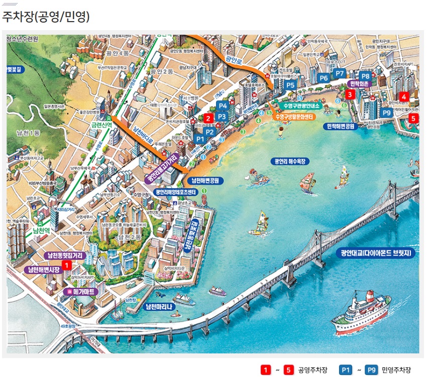 빨간색 1~5까지 공영주차장이고 파란색 P1~P9까지 민영주차장입니다. 하지만 인파가 몰려 주차장까지 진입이 쉽지 않고 주차장에 자리가 없으면 아주 난감할 수 있습니다.