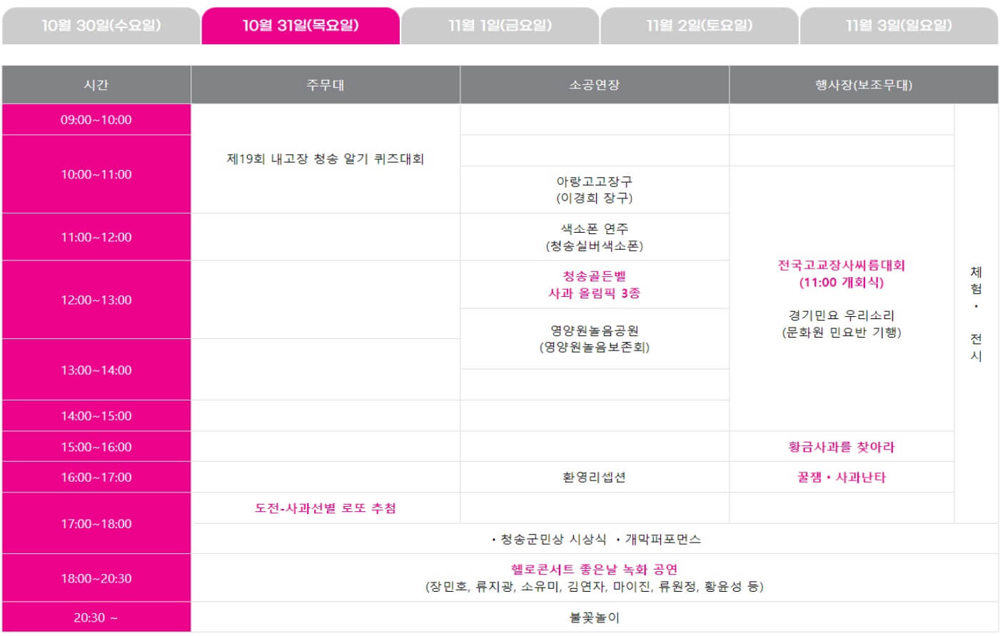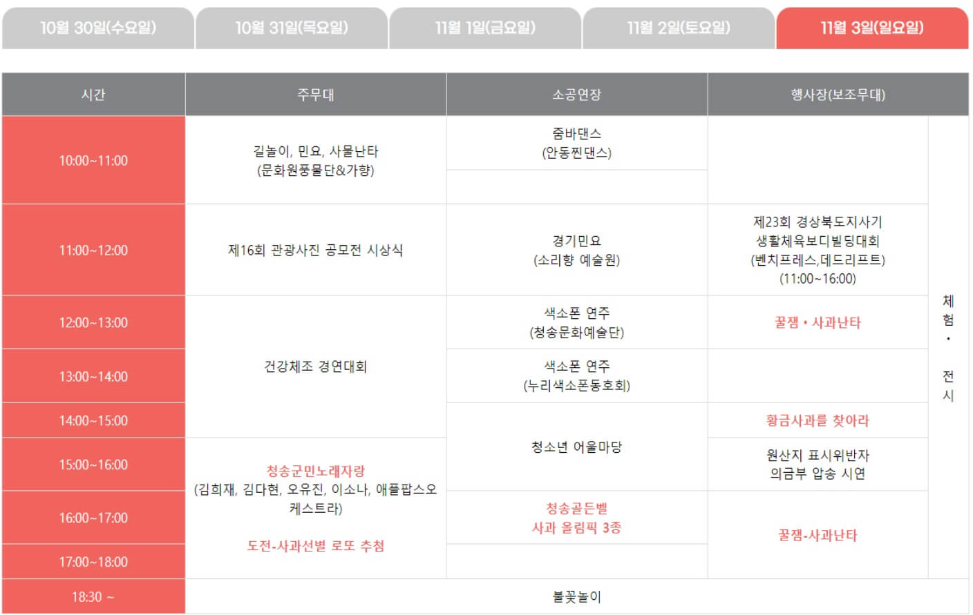 2024 청송사과축제는 남녀노소 누구나 재미있게 즐길 수 있는 다양한 프로그램이 준비되어 있습니다. 축제가 진행되는 5일동안 매일 축하공연이 이어지는데요. 하루씩 살펴보겠습니다.