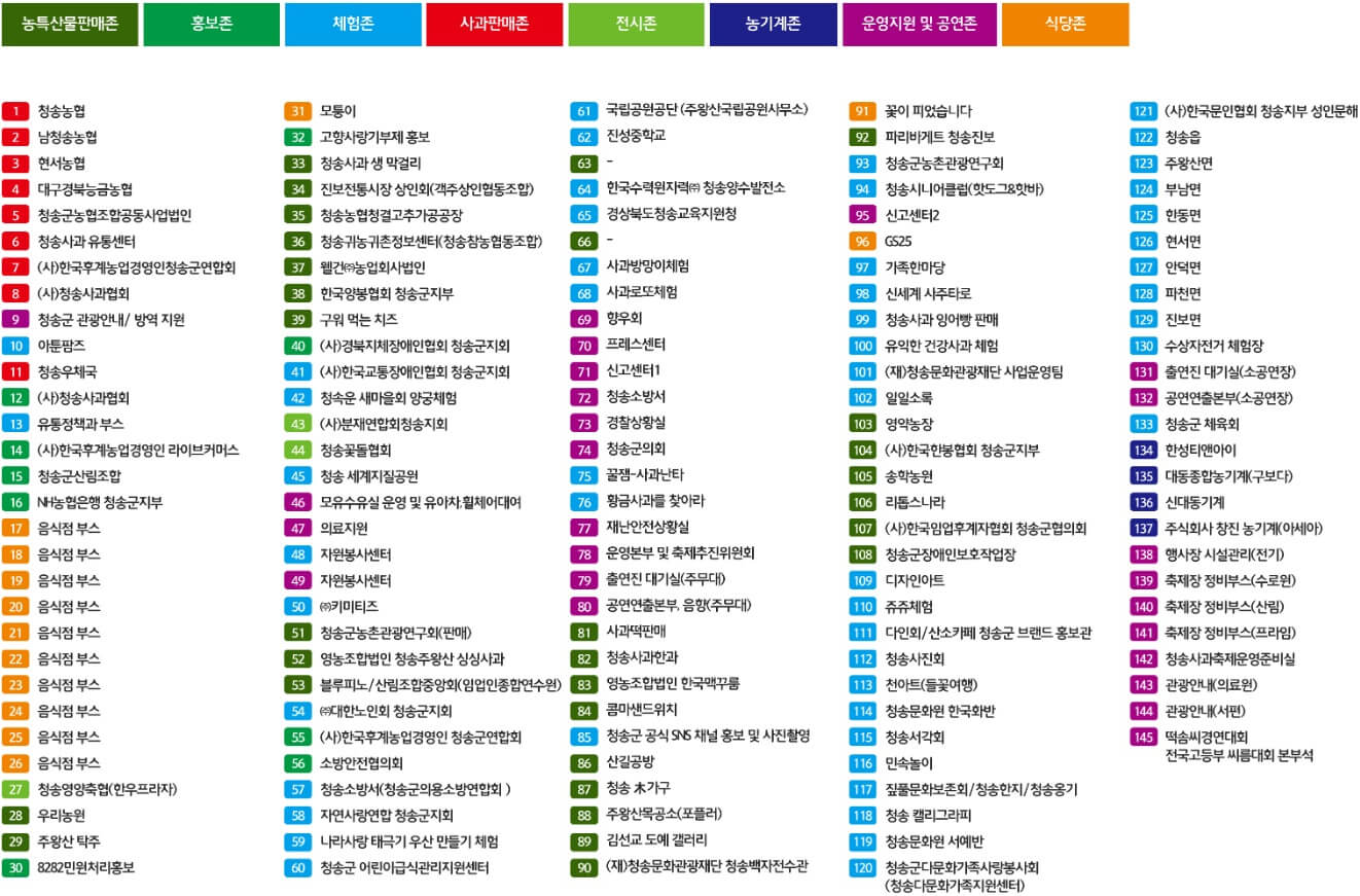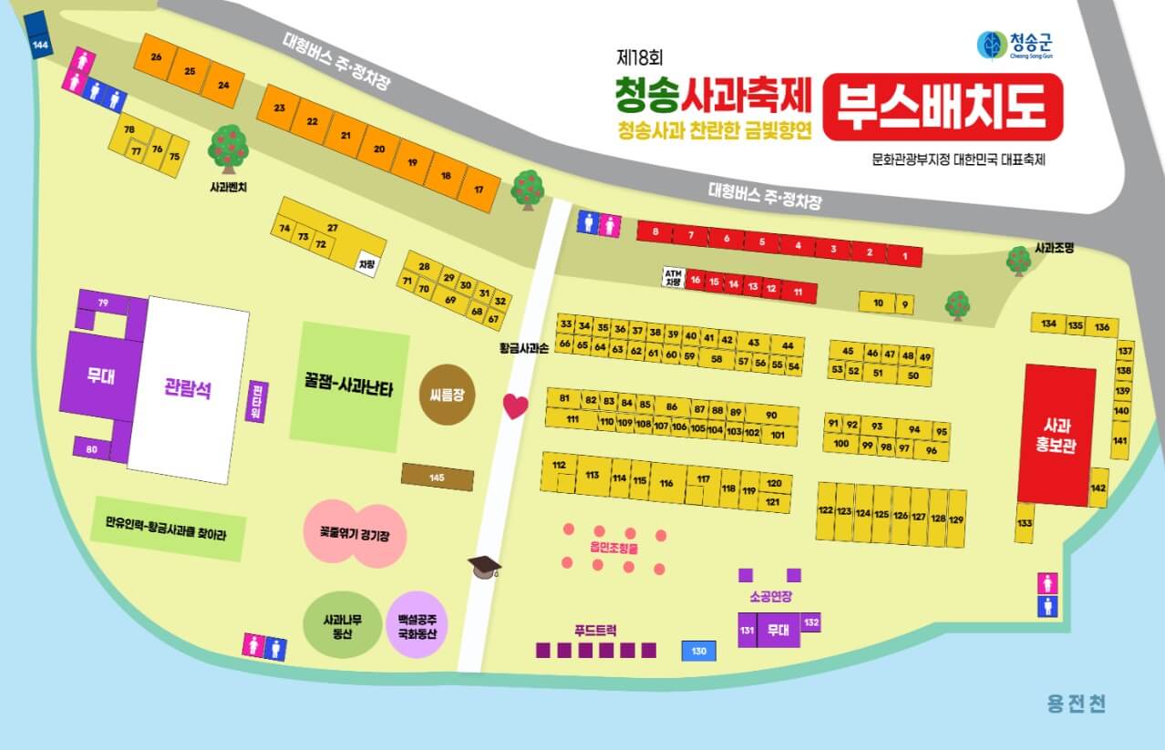 공연과 체험활동을 즐기실 때 필요한 청송사과축제 부스배치도입니다.