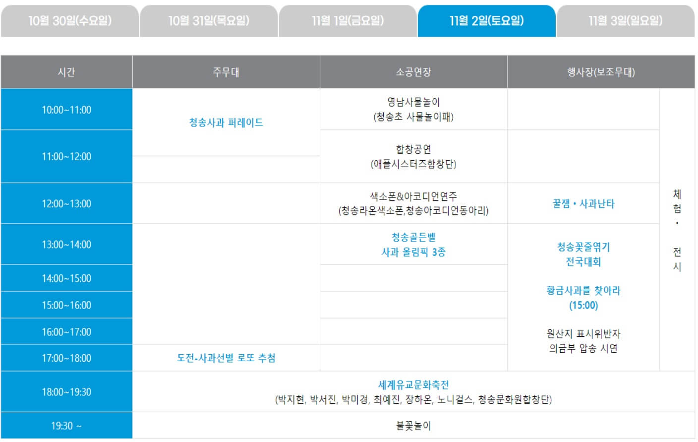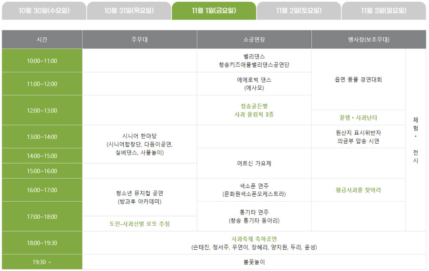 셋째날 사과축제 축하공연은 오후 6시에 시작하고 초대가수는 손태진, 정서주, 우연이, 장혜리, 양지원, 두리, 윤성입니다. 공연 후 오후 7시 30분부터 불꽃놀이가 이어집니다.