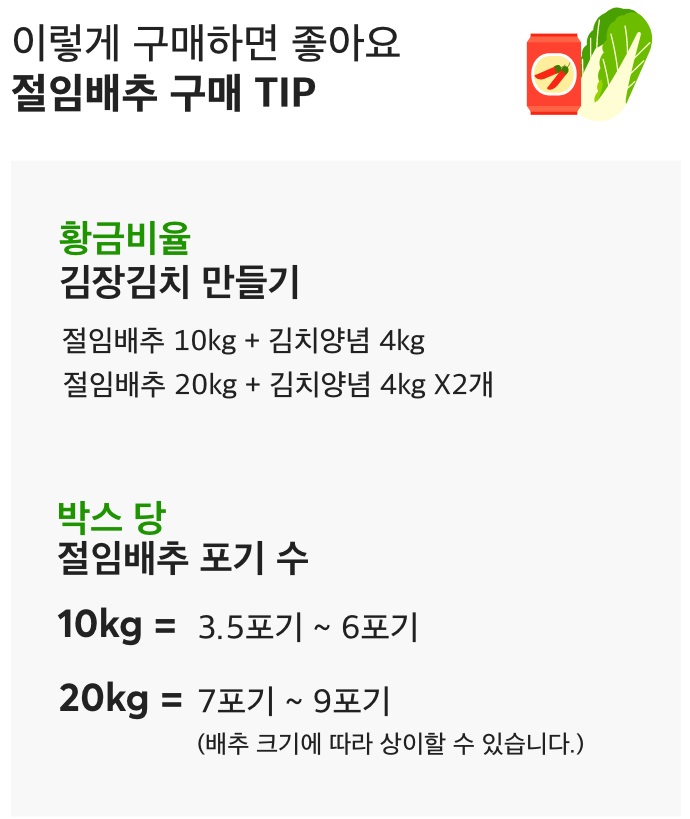 절임배추는 보통 20kg에 7~9포기 정도 됩니다. 김장 담글 양을 잘 계산하셔서 10kg와 20kg 선택하시면 됩니다. 마트 행사나 온라인 쇼핑몰 구매시에는 신용카드 할인혜택을 꼭 확인하시고 묶음구매시 할인되는 부분도 체크하셔서 최대혜택을 받아 저렴하게 구입하시기 바랍니다.