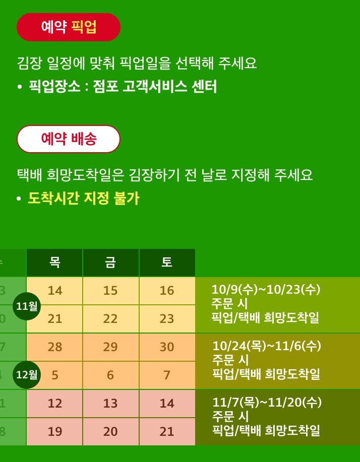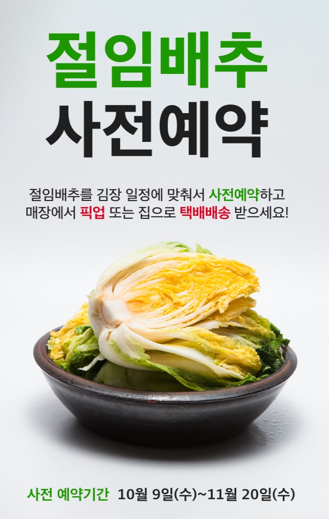 홈플러스는 11월 20일까지 배추 물가를 잡는 해남 절임배추 사전예약 행사를 진행합니다. 해당 기간에 주문하면 11월 14일 ~ 23일에 받아볼 수 있습니다. 오프라인 매장 고객서비스센터와 온라인몰에서 신청할 수 있으니 아래 링크를 참고하시기 바랍니다.