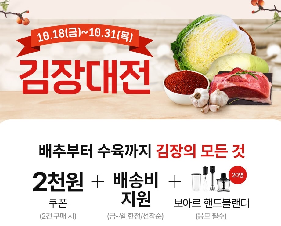NS홈쇼핑에서도 10월 31일까지 김장대전 행사를 펼칩니다. 해남 절임배추 20kg를 비롯한 김장 속재료, 수육 등 알뜰하게 구입할 수 있습니다. 행사기간 중 2건 구매시 2,000원 할인쿠폰, 배송비 쿠폰 등 혜택이 있으니 확인해보시기 바랍니다.